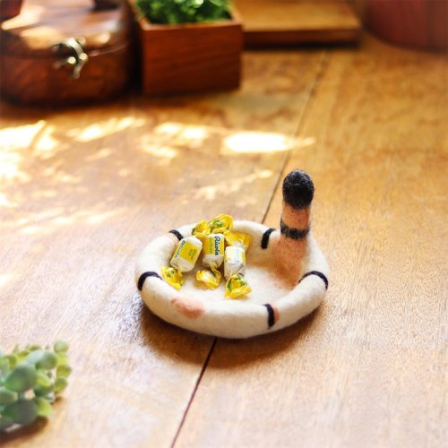 猫好きさんにはたまらないネコのしっぽトレイ。 ハンドメイドで作られた温もりあふれる柔らかい風合いです。 ナチュラルな雰囲気で、インテリアに馴染みます。 ちょっとした小物にちょうどいいサイズ。 ヒツジの毛を広げて石鹸水などを含ませて、もんだり巻いたり転がしたりすることで作られます。
