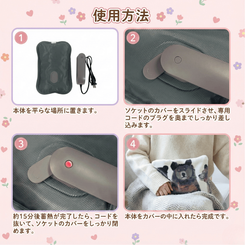 ・必ずカバーに入れて使用してください。湯たんぽ本体のみでは絶対に使用しないでください。
