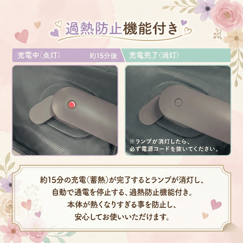 ・本品の寿命は蓄熱回数約1000回程度が目安です。それを過ぎると充電時間が長くなったり、温度が上がらなくなります。