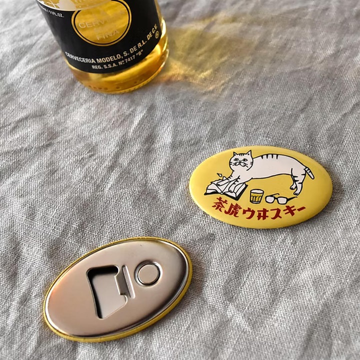 茶虎ウヰスキーと猫印微力マッサージのデザインでマグネット付きの栓抜きが登場。 冷蔵庫に貼り付けておけば無機質な家電が可愛いくなるうえ、いざというときに活躍します。 素材は缶で、缶バッジ風のつくりになっております。 重さは約23gで軽いです。 携帯しているとアウトドアやピクニックの際にも重宝しますよ。