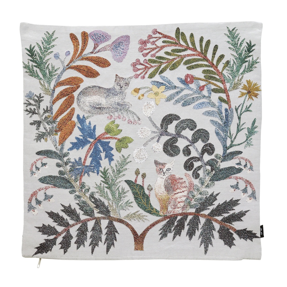 クラシカルな風合いが魅力のゴブラン織りに、松尾ミユキさんらしい、植物と動物の切り絵モチーフが映えるクッションカバーです。 ネコや鳥、草花たちがリズミカルに並び、静かな物語を感じさせてくれるデザイン。 生地はしっかりとした仕立てで、季節を問わず使えるように仕上げています。
