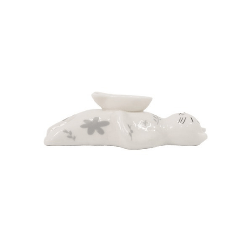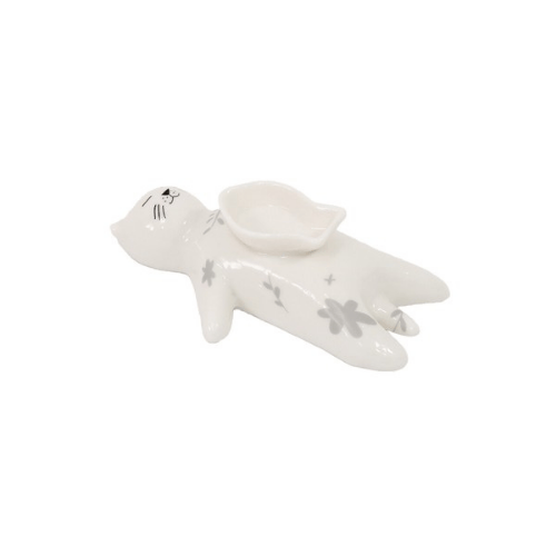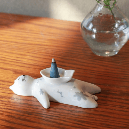 寝転がった猫のお腹にある魚型の器にコーン型のお香を置けば、やさしい香りとともに癒しのひとときを楽しめます。