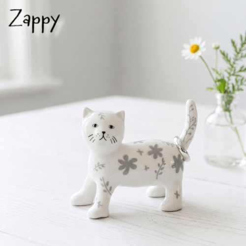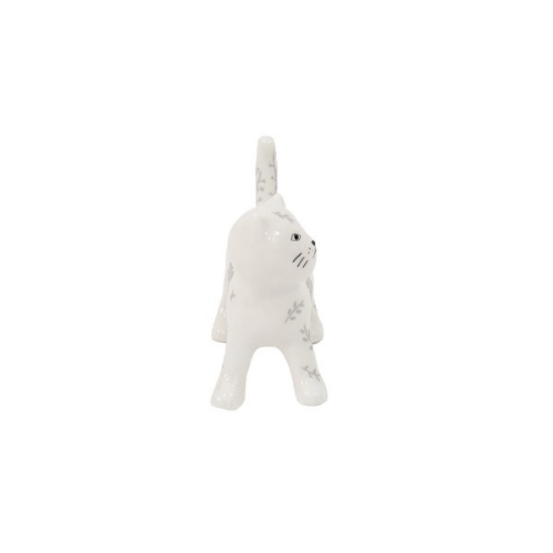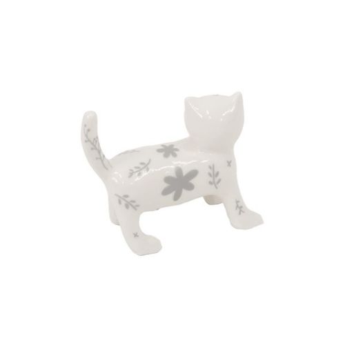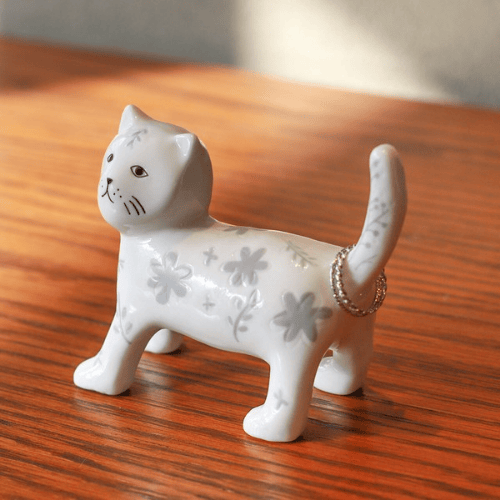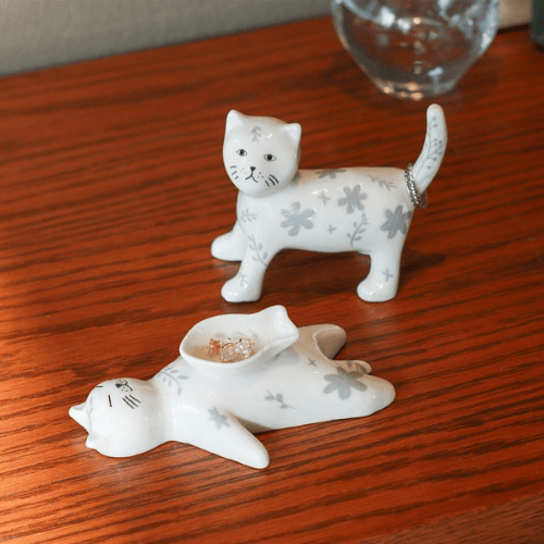 愛らしい花柄をまとった磁器製の猫のリングホルダーです。尻尾にリングをかけたり、オブジェとして飾ることで、お部屋に存在感を与えてくれます。玄関やリビングに飾ると、インテリアに可愛らしいアクセントを添えられ、同シリーズの「ねこのインセンストレイ」と揃えると卓上に心和む空間が広がります。